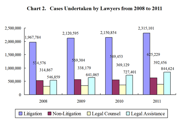 The graphics shows cases undertaken by lawyers from 2008 to 2011, according to China's white paper on judicial reform published by the Information Office of the State Council on Oct. 9, 2012.