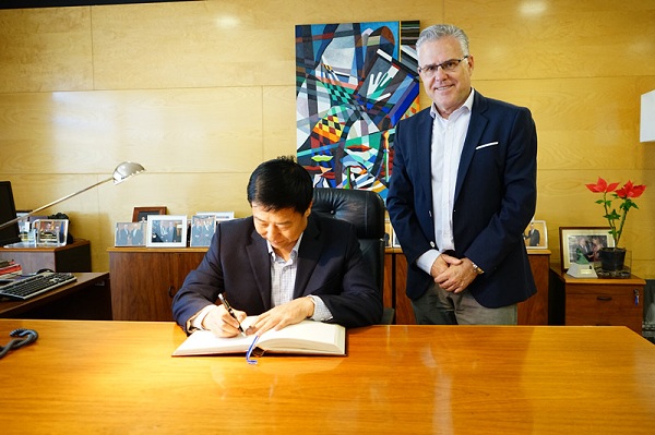 Tan Jingfeng (L) signs Saluo city’s guestbook in the presence of Pere Granados Carrillo (R).[Photo/nmgsports.gov.cn]