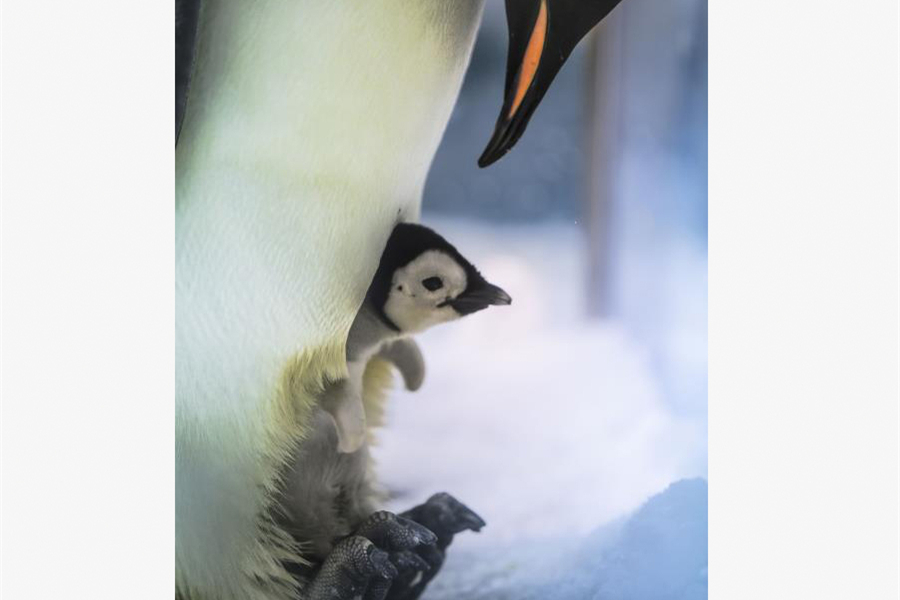 A baby emperor penguin peeks out of the pouch of its father at Chimelong Ocean Kingdom in Zhuhai, South China's Guangdong province. [Photo provided to chinadaily.com.cn]