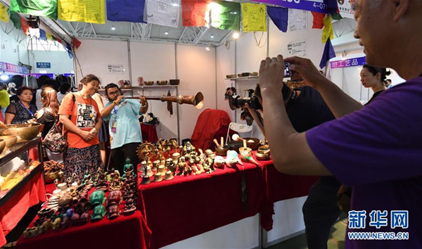 A visitor poses with an artist from Nepal at the folk fair. This year's fair has five themed exhibition zones. Visitors can see ceramic and international wood artware, as well as stone sculpture. [Photo/Xinhua]