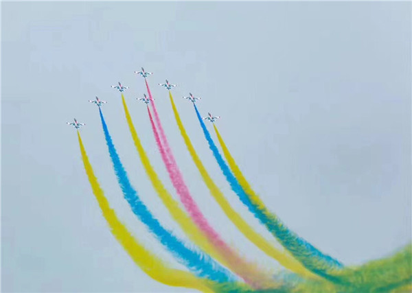 Jets make a rainbow during the "aviadarts" competition of the International Army Games 2017 held in Changchun, Northeast China's Jilin province, Aug 10, 2017. [Photo by Yuan Jigang/Provided to chinadaily.com.cn]