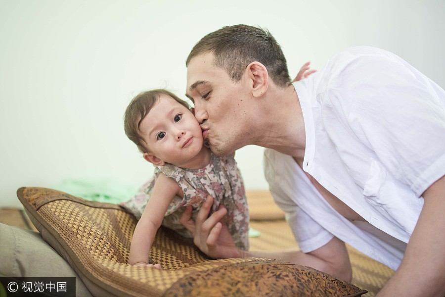 French entrepreneur Julien Vandelli kisses his daughter in Guangzhou, South China's Guangdong province, Aug 8, 2017. [Photo/VCG]