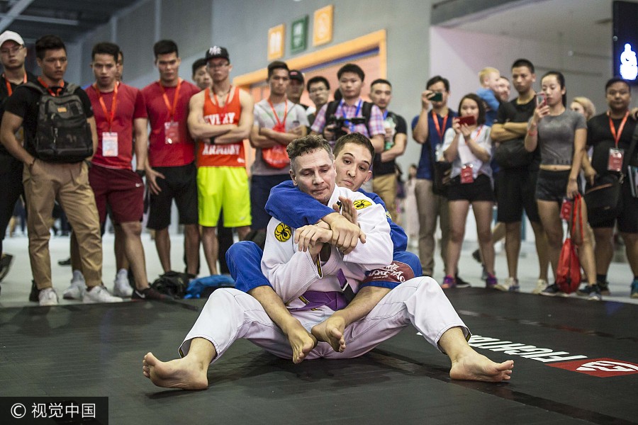 Julien Vandelli demonstrates how to practice Brazilian Jujitsu in Guangzhou, South China's Guangdong province, Aug 5, 2017. [Photo/VCG]