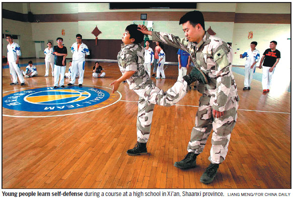 Personal safety and security combat simulation drills are essential components of a weeklong training course for students in Guangzhou, capital of Guangdong province, who will soon leave to study overseas.