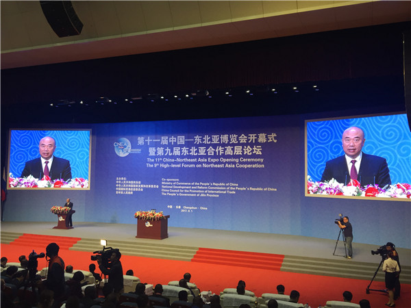 | The opening ceremony of the 11th China-Northeast Asia Expo and the 9th High-level Forum on Northeast Asia Cooperation was held on Sept 1, in Changchun, capital of Jilin province. Liu Guozhong, governor of Jilin province, delivers a speech at the ceremony. [Photo/chinadaily.com.cn] |