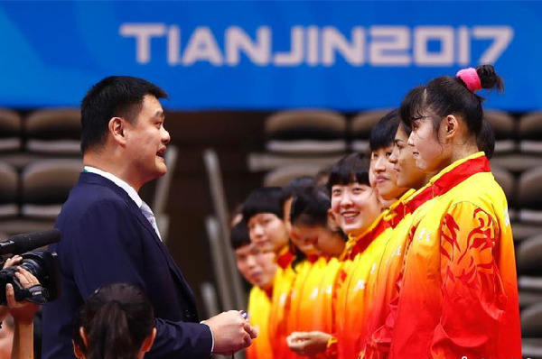 Yao Ming, president of Chinese Basketball Association, presents awards to the Guangdong team, silver medal winner in under-18 women's basketball at 13th Chinese National Games in north China's Tianjin municipality. [Photo by Xu Zhongru/yinsha.com]
