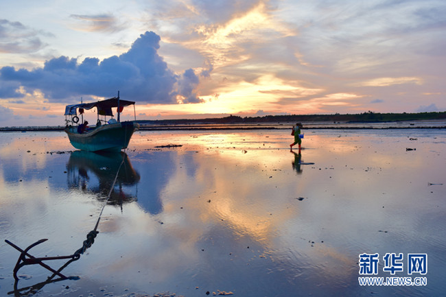 The coastal beach at Piliao Bay in Donghai Island mirrors the sky above at sunset on Sept 23.[Photo by Weng Wen/www.news.cn]