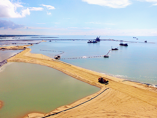 | Construction of the cargo-passenger ro-ro terminal of Xuwen Port is 35 percent finished. [Photo by Liu Jicheng/Zhanjiang Daily] |