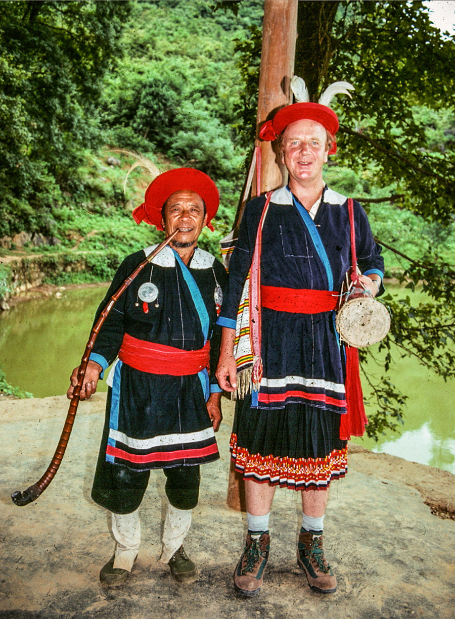 | Bruce(R) dresses in Yao ceremonial costume beside the village head. [Photo by Bruce Connolly/chinadaily.com.cn] |