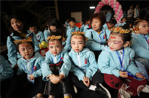 | Wuchuan Piaose is performed at the competition, with children aged between six and 12 held aloft on a hidden steel bar, dressed in red and holding lanterns. [Photo by Li Zhong/Zhanjiang Daily] |