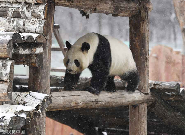 Meng Meng climbs on the wooden ladder in Changchun, on Nov 2, 2017. [Photo/VCG]