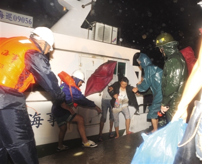 | As Typhoon Utor approaches Zhanjiang, the bureau helps an expectant mother to hospital on Aug 14, 2013. [Photo/Zhanjiang Maritime Safety Administration] |