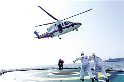 | A helicopter takes part in a maritime rescue exercise to save passengers in distress. [Photo/Zhanjiang Maritime Safety Administration] |