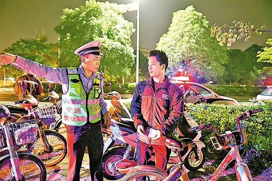 An officer lectures a share-biker who was riding on the roadway. [Photo provided to chinadaily.com.cn]