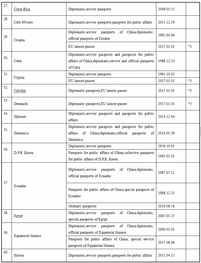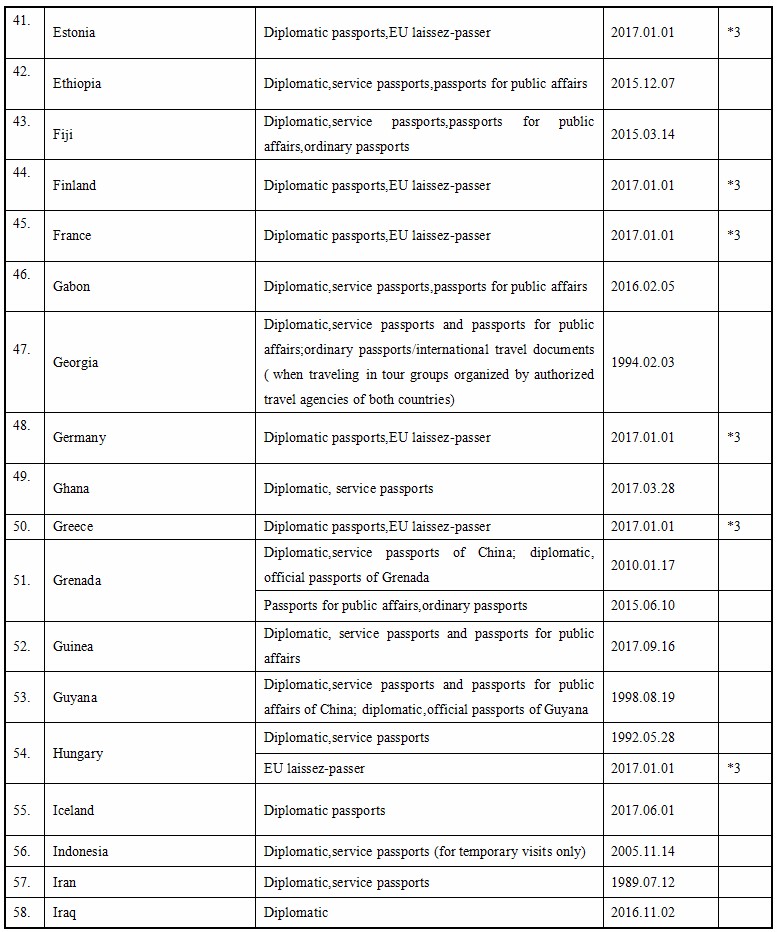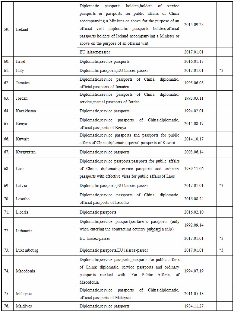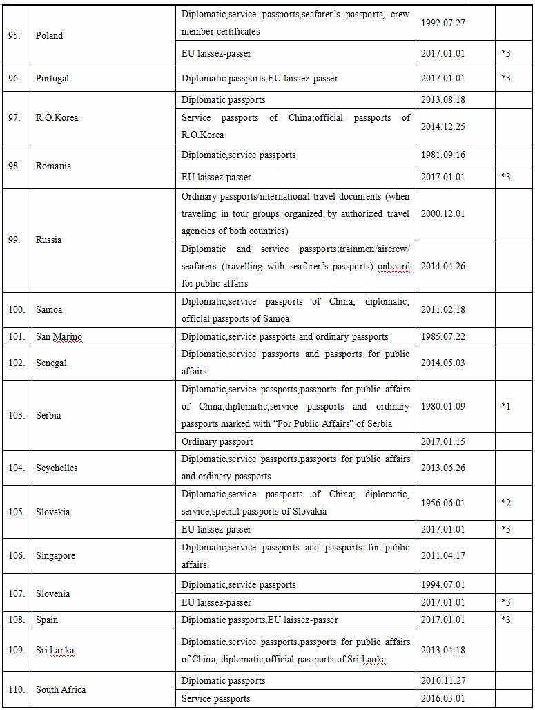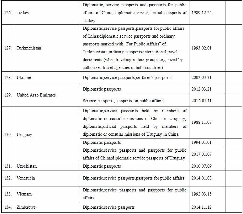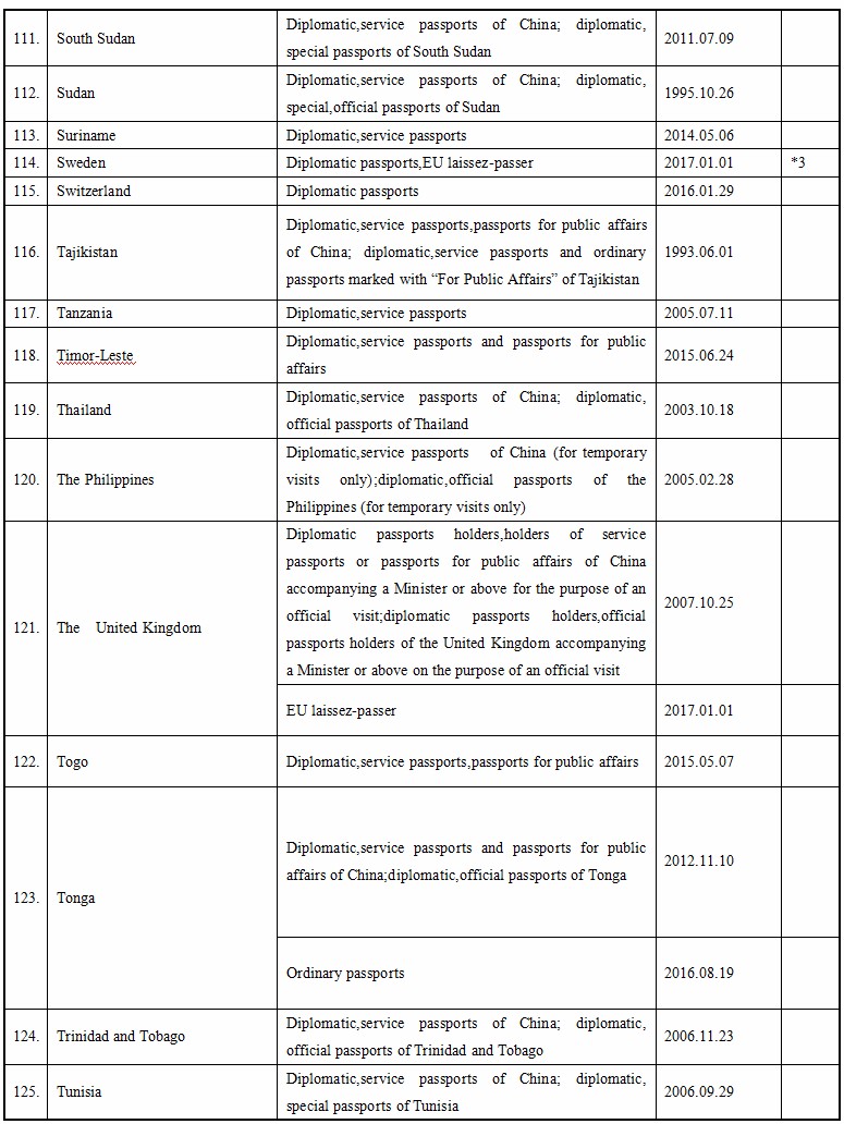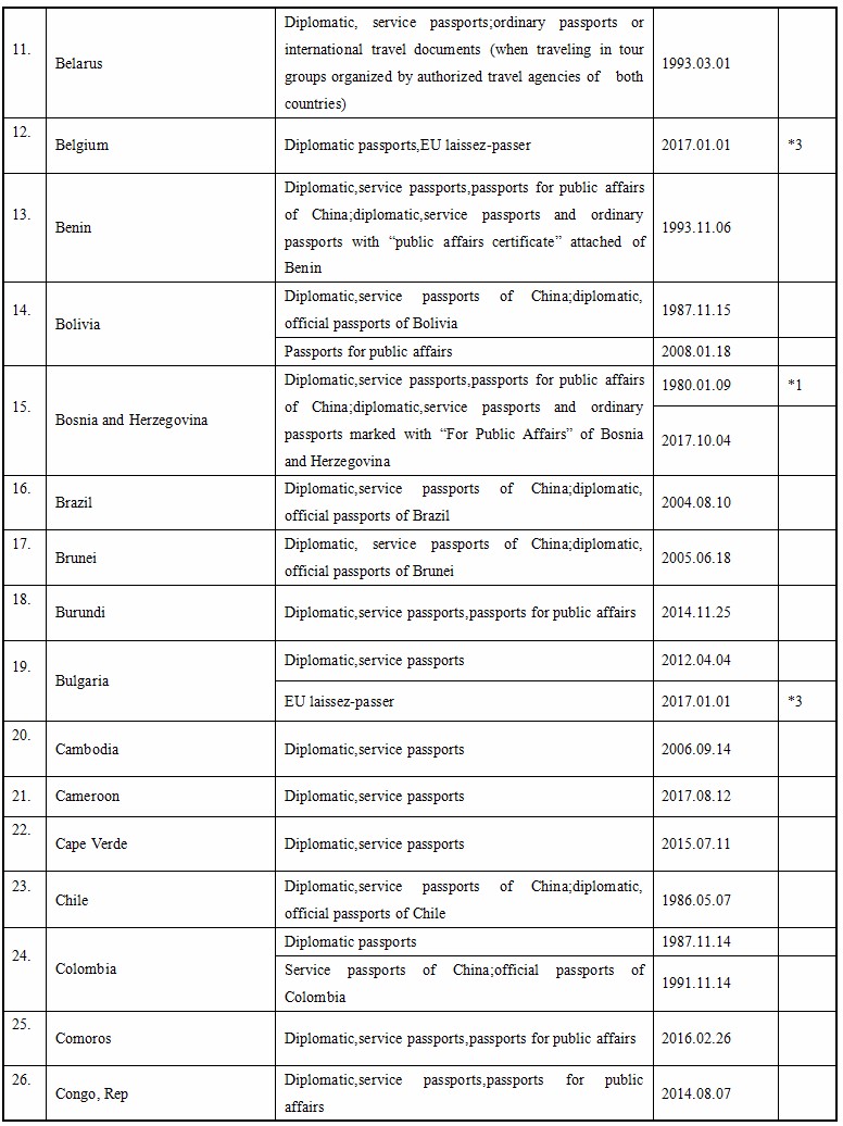 Up to September 16, 2017, the People’s Republic of China and the following foreign countries have concluded agreements on mutual visa exemption below. Citizens of the People’s Republic of China who are holders of valid specified passports are usually exempted from visa requirements for a short visit to the following foreign countries.