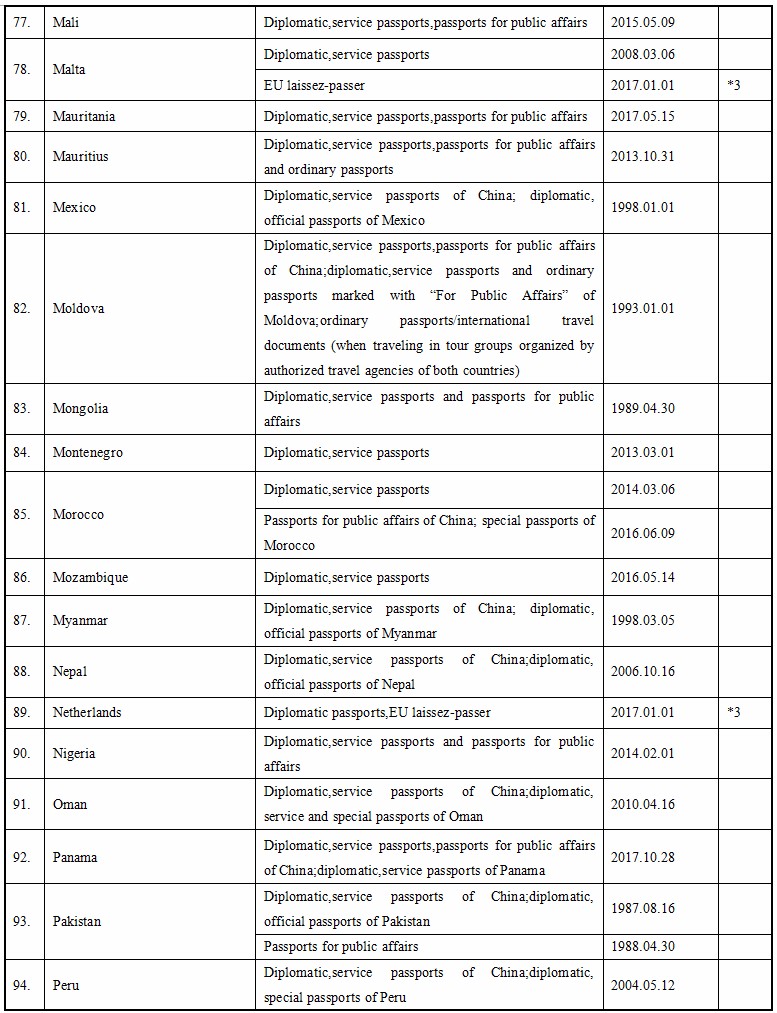 Exemption of visa requirements does not mean permission to stay and reside in the other contracting country for an indefinite period of time. According to the agreements, holders of valid specified passports are permitted to stay for less than 30 days upon entry into the other contracting country. If a passport holder intends to stay for over 30 days, he or she should go through residence formalities with the local authorities according to relevant regulations as soon as possible.