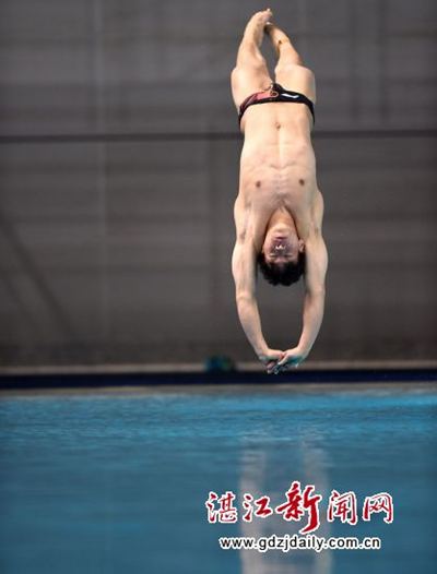 | He Chao dives from the high board. [Photo/gdzjdaily.com.cn] |