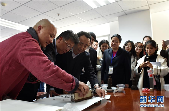 | Wei Lizhong demonstrates how to do woodblock printing at Tianjin Normal University on Jan 8.[Photo/Xinhua] |