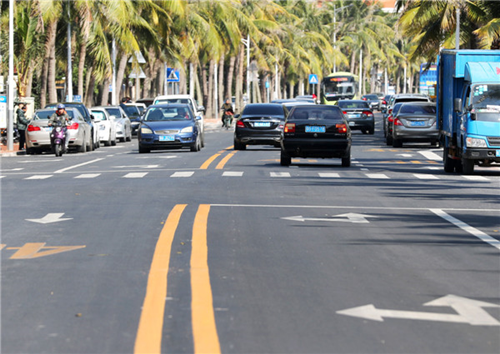 Traffic signs are painted against the lanes at the south section of the Guanhai Road. [Photo by Wu Zhiheng/Zhanjiang Daily] |