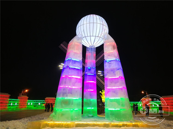 | An ice lantern named "the Light of a Prosperous Age" is built in a flower bed near the south gate of the park. The ice work depicts the blue earth lifted by three four-meter pillars with colorful lights, which symbolizes a bright future for the world. [Photo/cnjiwang.com] |