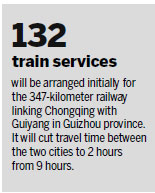 It will cut travel time between Chongqing and Guiyang to 2 hours from 9 hours, between Chongqing and Guangzhou to 7 hours from 12 hours, and between Chongqing and Kunming to 4 hours 40 minutes from 19 hours.