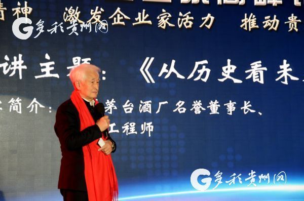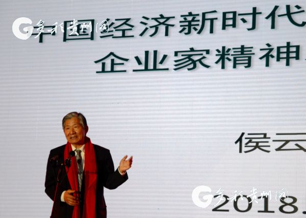| Ji Keliang, honorary chairman of Kweichou Moutai Group, talks about his company's success at the 2018 Guizhou Entrepreneur Summit held in Guiyang, Guizhou province, on Jan 14. [Photo/news.gog.cn] |