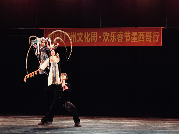 A puppet show featuring a duo of dragon and phoenix-shaped puppets is performed by Guangzhou artists in Mexico City. [Photo provided to chinadaily.com]
