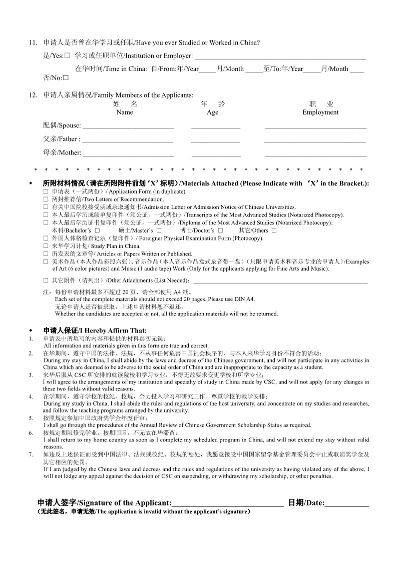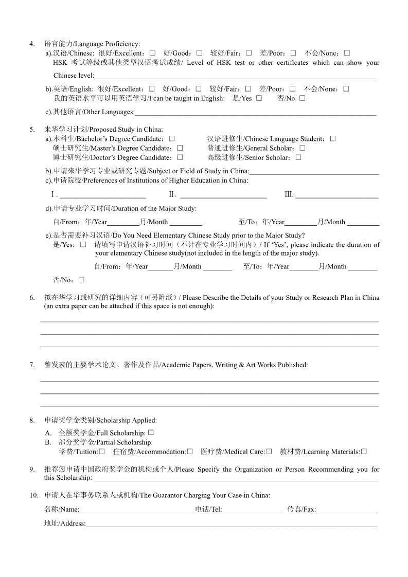 Application Form for Chinese Government Scholarship
