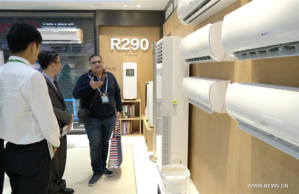 A businessman selects air conditioner during the China Import and Export Fair in Guangzhou, capital of south China's Guangdong Province, April 15, 2018. The fair, with more than 25,000 exhibiting companies from at home and abroad, opened here on Sunday. (Xinhua/Liang Xu)