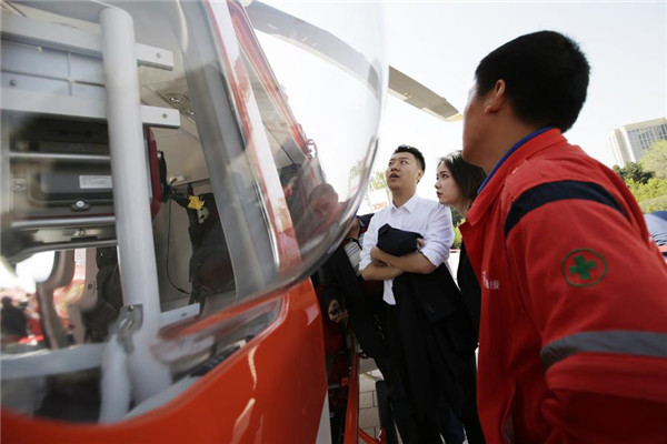 A man introduces the interior of an air rescue helicopter on April 28. [Photo/Xinhua]
