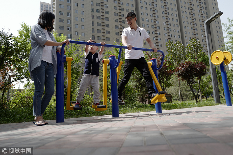 Wang Yang and Zhou Na enjoy time with their child in Taiyuan, capital of North China's Shanxi province. [Photo/VCG]