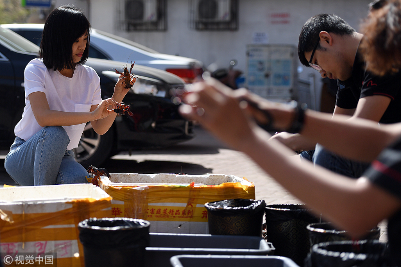Zhou Na sorts crayfish in Taiyuan, capital of North China's Shanxi province. [Photo/VCG]