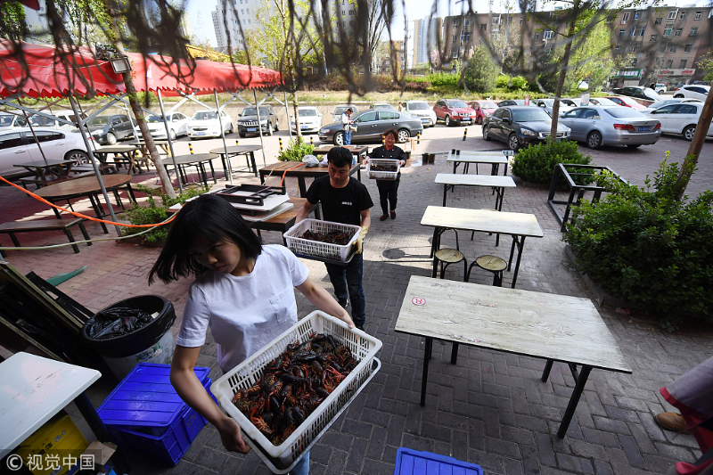 Zhou Na and employees move boxes of crayfish to kitchen in Taiyuan, capital of North China's Shanxi province. [Photo/VCG]