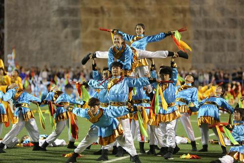 An opening ceremony is held for the 2018 Sports Meeting of Inner Mongolia University of Science and Technology (IMUST) on May 16. Performances featuring elements of traditional Mongolian culture were staged including Bokh (Mongolian wrestling), archery and morin khuur (a traditional Mongolian bowed string instrument also known as the horsehead fiddle). [Photo/Baotou Daily]