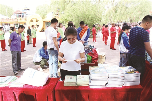 Baotou residents read free promotional tourism booklets on May 16. [Photo/Baotou Daily]