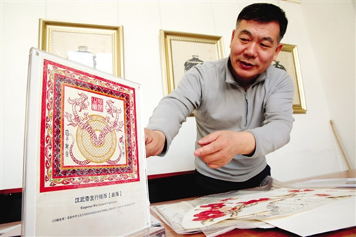 Copies of sheepskin paintings of the bai lu pi bi – “white deer skin coin”, a currency used during Emperor Wu of Han’s reign – have been registered with the National Copyright Administration. [Photo/Baotou Evening News]