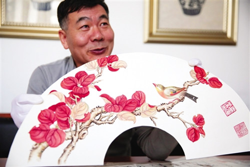 A Ji clan sheepskin painting takes the form of a fan. [Photo/Baotou Evening News]