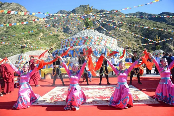 A folk performance is staged at Tumd Right Banner’s fourth ovoo cultural festival opening on June 28. Ovoo, or Oboo in Mongolian, are sacred stone heaps used as shrines or altars. Ovoos mainly serve as sites for religious ceremonies, but they are also thought to bring a good harvest and bestow good health on an individual. [Photo/wenming.cn]