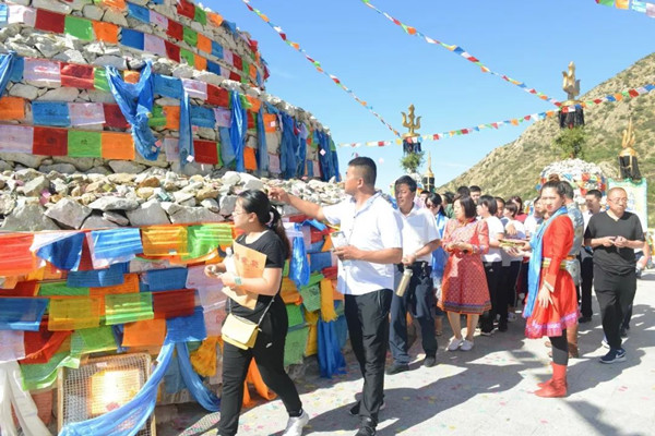 A crowd prays while circling an ovoo, June 28. The ceremony was held to give thanks to nature, and to allow people to pray for favorable weather conditions and a good harvest. [Photo/wenming.cn]