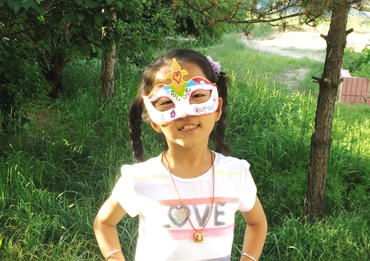 A young journalist of Baotou Daily wears a self-painted face mask during a DIY activity, July 9. The activity, co-hosted by Baotou Daily and Baotou Young Journalists’ Association, attracted the participation of children from across the city eager to try out life as a journalist. [Photo/Baotou Evening News]