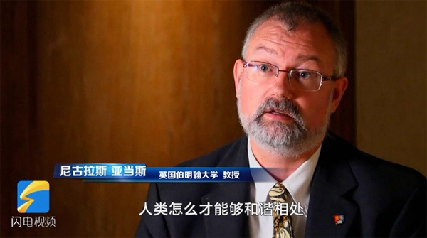 Nicholas Adams, a professor at the University of Birmingham, gives an interview to Shandong local media outlet. [Photo/iqilu.com]