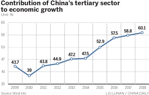 The value added of the tertiary sector increased by 7.6 percent year-on-year to 46.96 trillion yuan ($6.92 trillion) in 2018, accounting for 52.2 percent of the country's gross domestic product, up by 0.3 percentage point from 2017. The growth rate of the value added of the tertiary sector was 1.8 percentage points higher than that of the secondary industry.