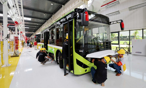 Employees work on a production line of Hope Automobile in the Guangxi Zhuang autonomous region. [Photo by Tan Kaixin/For China Daily]