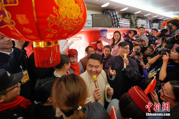 Train staff members perform a comic dialogue on the K111 on Jan 22, 2019. [Photo/Chinanews.com]