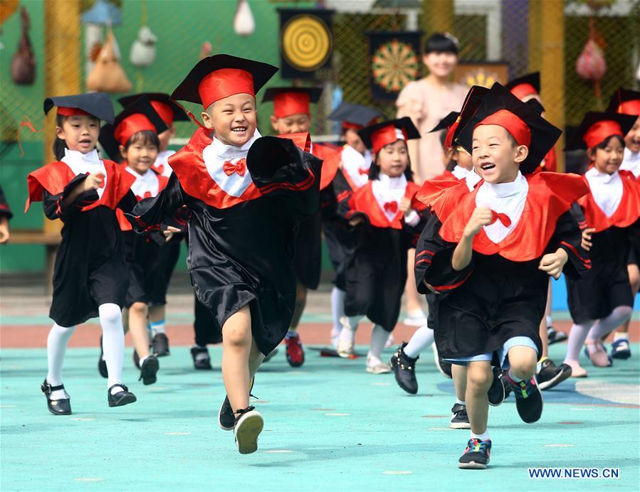 Kindergarten children wearing gowns of Doctor Degree run at the Hedong District No 2 Kindergarten in Tianjin, June 17, 2016. [Photo/Xinhua]