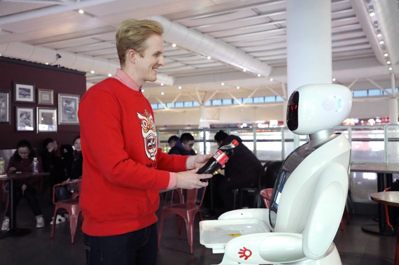 Passengers experience smart robot delivery in the 5G experience area of Shanghai Hongqiao Railway Station on Feb 18. [Photo provided to chinadaily.com.cn]