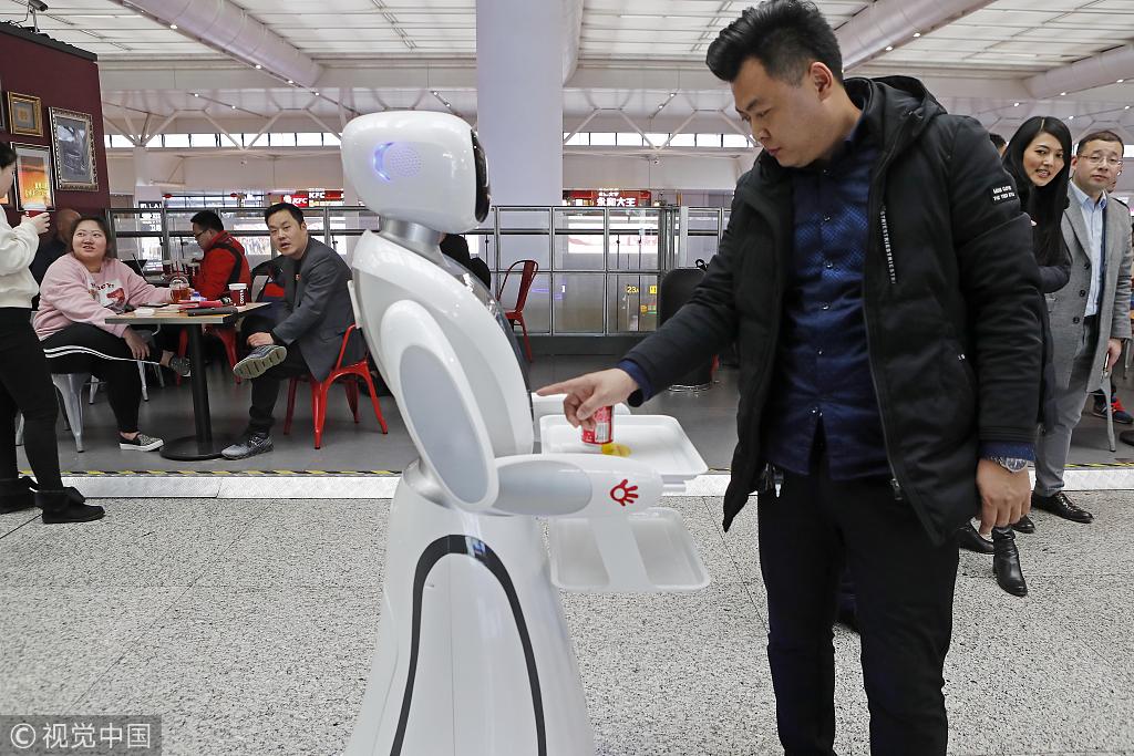 Passengers experience smart robot delivery in the 5G experience area of Shanghai Hongqiao Railway Station on Feb 18. [Photo/VCG]