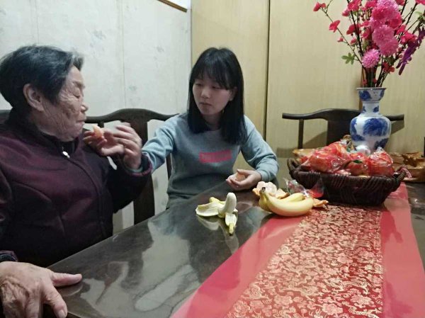 Wang Xinhang feeds Tan Fangpei an orange. [Photo by Zhu Rong]