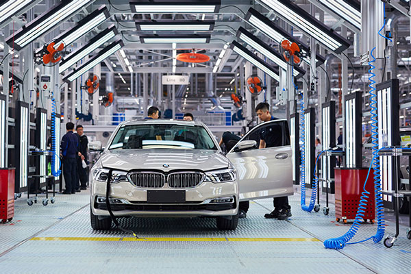 Workers inspect a car at BMW Brilliance's Dadong plant in Shenyang, Liaoning province in May 2017. [Photo provided to China Daily]