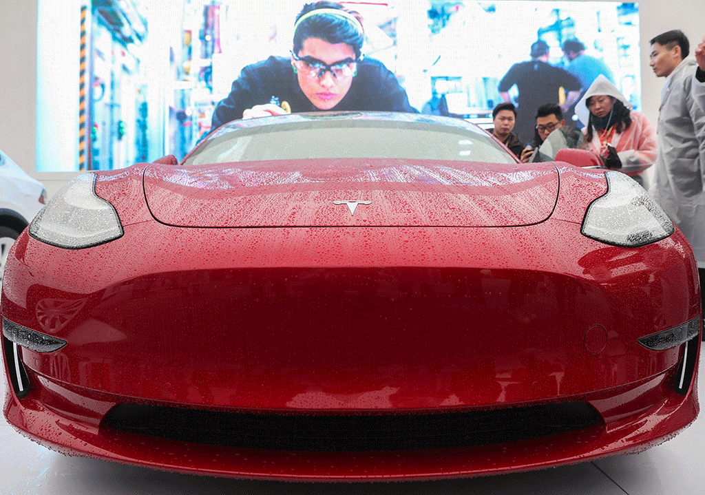 A Tesla Model 3 is displayed at the groundbreaking ceremony for the Tesla Shanghai Gigafactory on Jan 7. At$7.3 billion, the company's investment is the biggest financial injection from overseas in the city's manufacturing sector. [Photo/Xinhua]